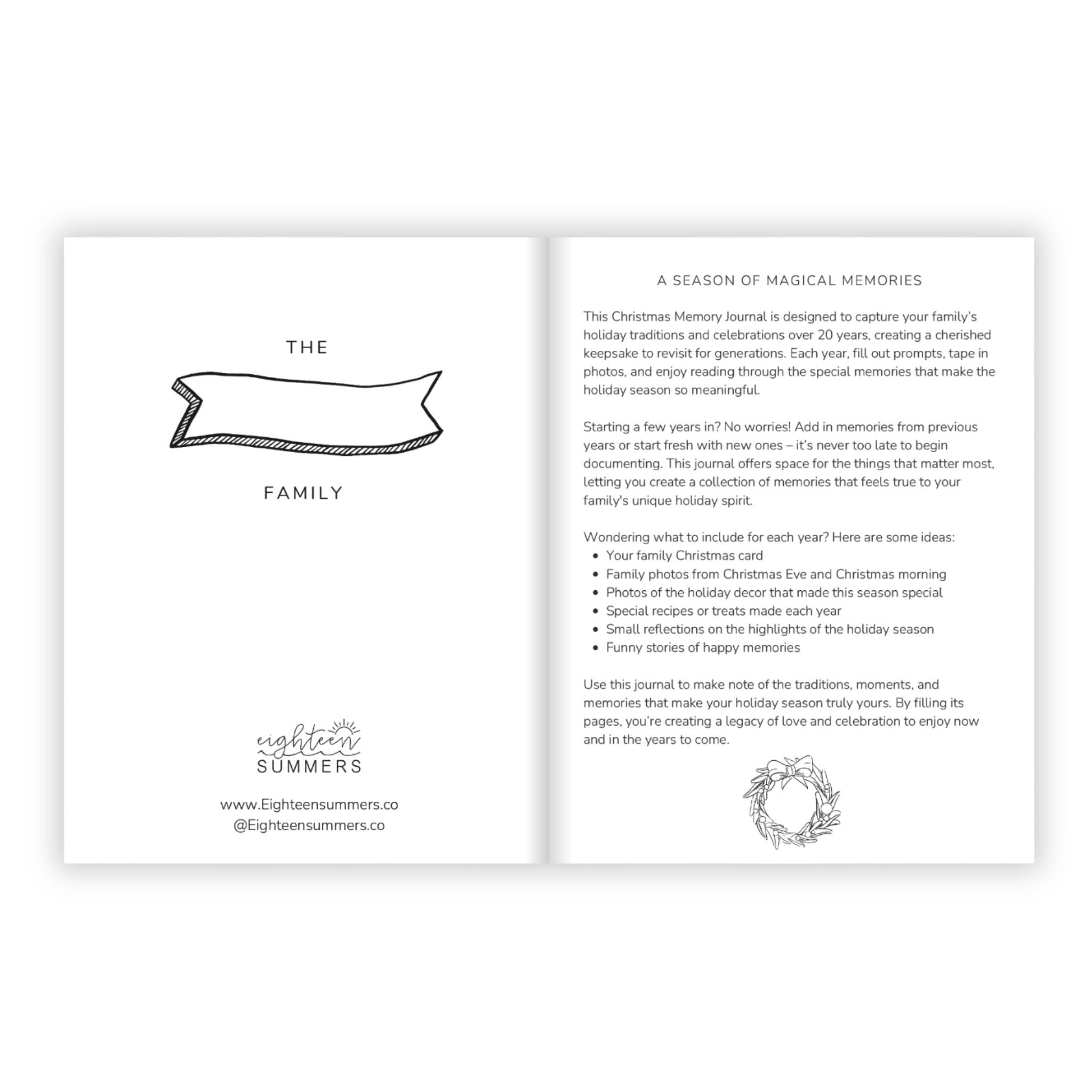 Capture the spirit of your family’s holiday traditions with our Christmas Memory Journal, designed to document 20 years of joyful celebrations. This keepsake is perfect for revisiting each year, preserving memories that become part of your family’s holiday legacy.